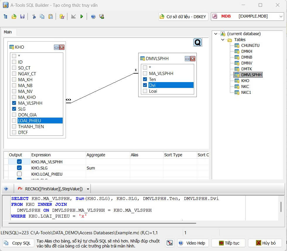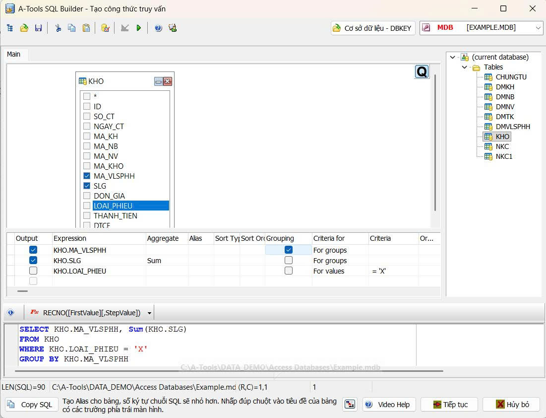 Tại dòng SLG cột Aggregate chọn hàm “Sum” để tổng hợp số lượng và dòng MA_VLSPHH chọn “Grouping”