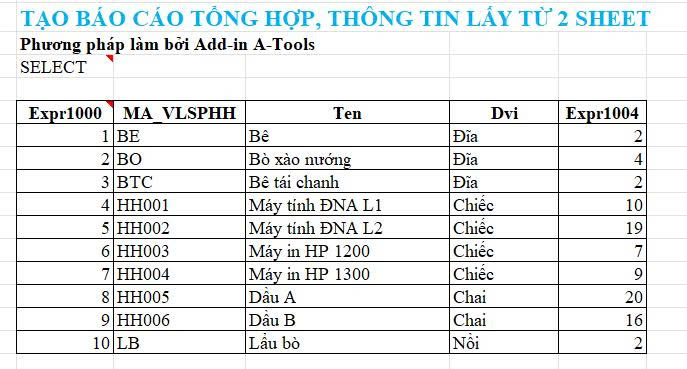 Video Hướng dẫn Hàm BS_SQL Tạo báo cáo tổng hợp dữ liệu từ 2 sheet, hàm VTC tách cột trong Add-in A-Tools