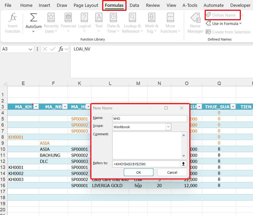 Bước 1: Đặt tên vùng dữ liệu nguồn cần làm báo cáo DEFINE NAME ở file ví dụ này là KHO và Danh mục VLSPHH. Để đặt tên vùng ta làm như sau vào Fomulas/Define Name/Bôi đen vùng dữ liệu bao gồm cả tiêu đề.