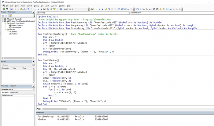 Tốc độ các hàm tôi viết trong Delphi đều nhanh hơn VBA, trong đó hàm FastSumArray nhanh gấp 4-5 lần. Các bạn có thể test để xem kết quả ra sao.
