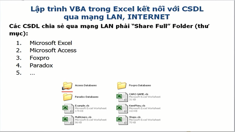 Bài viết này tôi hướng dẫn mọi người dùng ADO kết nối tới CSDL Access trong mạng LAN, với các CSDL khác như Excel, Foxpro, SQL Server.... Các CSDL Access, Excel, Foxpro, Paradox,... chỉ có thể chia sẻ qua mạng LAN phải share folder vì vậy bảo mật không tốt, không thể chia sẻ qua Internet.