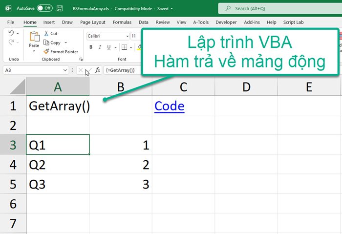 Bây giờ bạn đã có hàm UDF với tên GetArray() để chạy trên bảng tính Excel, hàm này trả về mảng tự co giãn kích thước với số phần tử của nó. Giống như các hàm mảng của Add-in A-Tools.