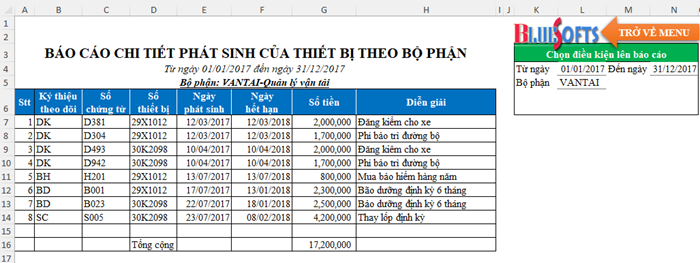 1. Báo cáo chi tiết phát sinh của thiết bị theo ngày và theo mã thiết bị