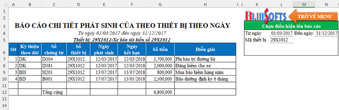 1. Báo cáo chi tiết phát sinh của thiết bị theo ngày và theo mã thiết bị