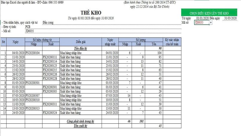 - Công thức lấy thông tin ra thẻ kho theo khoảng thời gian tự động, tự động tính toán số dư đầu kỳ theo thời điểm báo cáo