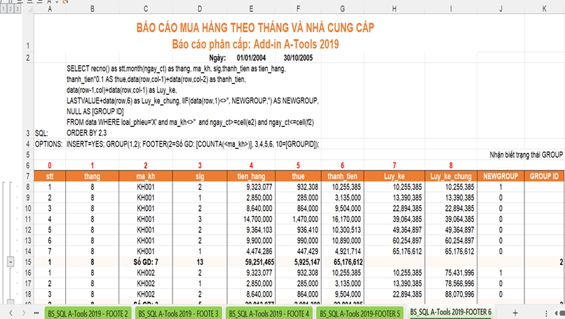 Các ví dụ trên giúp người dùng hiểu rõ cách sử dụng GROUP và FOOTER trong hàm BS_SQL của A-Tools. Nhờ đó, việc tạo báo cáo trong Excel trở nên tự động, linh hoạt và dễ kiểm soát hơn. Người dùng có thể mở rộng các mẫu này để tạo báo cáo nhiều cấp, hoặc thêm công thức tính tổng động.