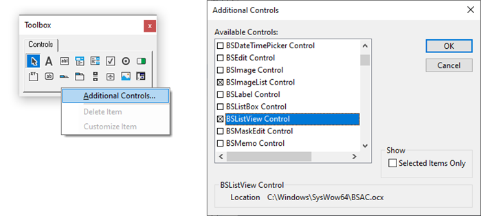 - Nhấp chuột phải trên Toolbox, chọn "Additional Controls..." rồi check các controls dùng cho lập trình, như BSImageList, BSListView, BSTreeView, BSListBox, BSComboBox, BSTaskPaneX, BSTooltip,...